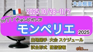 WTTチャンピオンズ 【卓球/概要】チャンピオンズモンペリエ2025【参加選手・スケジュールまとめ】 こんにちは、いまときです。 2025.10/28(火)〜11/2(日)の日程で『WTTチャンピオンズモンペリエ2025』が開催されます。 この大会はWTT(World Table Tennis)が主催する大会で、その賞金総額は50万ドル。日... 2025.09.19 WTTチャンピオンズWTTチャンピオンズ【2025】WTTチャンピオンズモンペリエ2025大会概要・日程大会概要・日程【2025】