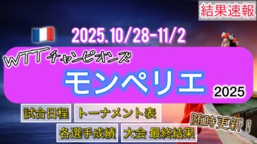 WTTチャンピオンズ 【結果速報‼︎】WTTチャンピオンズモンペリエ2025【トーナメント表・日本人結果まとめ】 こんにちは、いまときです。 この記事では、WTTコンテンダーモンペリエ2025の結果速報をお伝えします。 大会期間は2025.10/28(火)〜11/2(日)です。時差は8時間です。 随時更新していきますので、みなさん一緒に日本選手を応援し... 2025.09.19 WTTチャンピオンズWTTチャンピオンズ【2025】WTTチャンピオンズモンペリエ2025結果速報‼︎結果速報‼︎【2025】