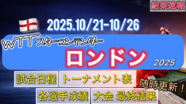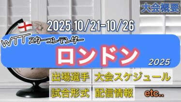 WTTスターコンテンダー 【結果速報‼︎】WTTスターコンテンダーロンドン2025【トーナメント表・日本人結果まとめ】 こんにちは、いまときです。 この記事では、WTTスターコンテンダーロンドン2025の結果速報をお伝えします。 大会期間は2025.10/21(火)〜10/26(日)。時差は8時間(サマータイム期間)です。 随時更新していきますので、みなさん... 2025.09.19 WTTスターコンテンダーWTTスターコンテンダー【2025】WTTスターコンテンダーロンドン2025結果速報‼︎結果速報‼︎【2025】