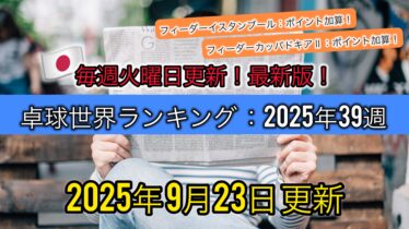 世界ランキング 【卓球】最新世界ランキング:2025年9月23日更新【#39】 こんにちは、いまときです。 毎週火曜日更新の卓球世界ランキング。 この記事では、2025年9月23日に更新された2025年第39週の最新世界ランキングをまとめます。 🇯🇵日本選手 世界ランキング(#39) 【男子シングルス】 4位 ( - ... 2025.09.23 世界ランキング世界ランキング【2025】卓球ニュース