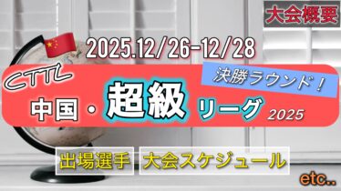 中国・超級リーグ 【卓球/概要】中国・卓球 超級リーグ2025(決勝ラウンド)【参加選手・スケジュールまとめ】 こんにちは、いまときです。 2025.12/26(金)〜12/28(日)の日程で『中国卓球スーパー(超級)リーグ2025』が開催されます。 今シーズンの中国・超級リーグは4つのラウンドに分かれ、4つの都市で開催されます。 第1ラウンドから第... 2025.10.11 中国・超級リーグ大会概要・日程大会概要・日程【2025】超級リーグ2025