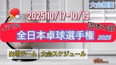 全日本卓球選手権 【卓球/概要】2025年全日本卓球選手権大会(団体の部)【出場チーム・スケジュールまとめ】 こんにちは、いまときです。 2025.10/17(金)〜10/19(日)の日程で『2025年全日本卓球選手権大会(団体の部)』が開催されます。 大会には男子12チーム、女子12チームが参加予定です。 ※情報は急遽変更になることがあります。変... 2025.10.11 全日本卓球選手権全日本卓球選手権2025(団体)卓球-日本リーグ大会概要・日程大会概要・日程【2025】