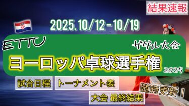 ITTF主催大会 【結果速報‼︎】ヨーロッパ卓球選手権2025【トーナメント表・試合結果まとめ】 こんにちは、いまときです。 この記事では、ヨーロッパ卓球選手権2025 ザダル大会の結果速報をお伝えします。 大会期間は2025.10/12(日)〜10/19(日)です。時差は7時間です。 【大会 最終結果】 【男子団体🏆】🇫🇷フランス 【... 2025.10.18 ITTF主催大会ヨーロッパ卓球選手権2025結果速報‼︎結果速報‼︎【2025】