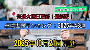 世界ランキング 【卓球】最新世界ランキング:2025年10月21日更新【#43】 こんにちは、いまときです。 毎週火曜日更新の卓球世界ランキング。 この記事では、2025年10月21日に更新された2025年第43週の最新世界ランキングをまとめます。 🇯🇵日本選手 世界ランキング(#43) 【男子シングルス】 4位 ( -... 2025.10.21 世界ランキング世界ランキング【2025】卓球ニュース